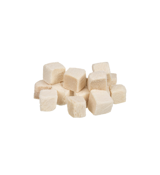 Freeze-Dried Chicken Breasts, to liofilizowany przysmak dla dorosłych kotów, przygotowany z 100% fileta z kurczaka. Liofilizacja to jedna z najdelikatniejszych metod utrwalania żywności, najpierw głęboko mrozimy produkt, a potem delikatnie usuwamy z niego wodę, przez co produkt zachowuje pełnię aromatu, smaku i wartości odżywczych świeżego mięsa. Dzięki temu każdy kawałek w postaci kosteczki jest nie tylko wyjątkowo smaczny, ale także wysokobiałkowy. Przysmak jest lekkostrawny, bez zbóż oraz bez dodatku cukru, co czyni go odpowiednim nawet dla kotów o wrażliwych układach pokarmowych i bardziej wymagających dietach.